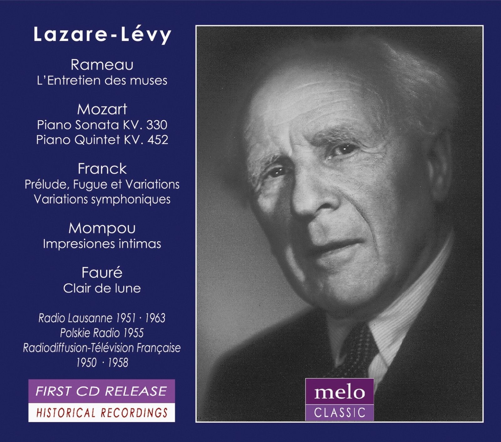 Enregistrés sur le vif à Paris, Lausanne et Varsovie, en concert ou en studio, les inédits que présente Meloclassic témoignent des derniers moments de l’activité de Lazare-Lévy, saisi là entre sa 67ème et sa 81ème année sur six instruments différents. Ils donnent pour la première fois l’opportunité de l’entendre au sein d’un orchestre ainsi que dans une page de musique de chambre.