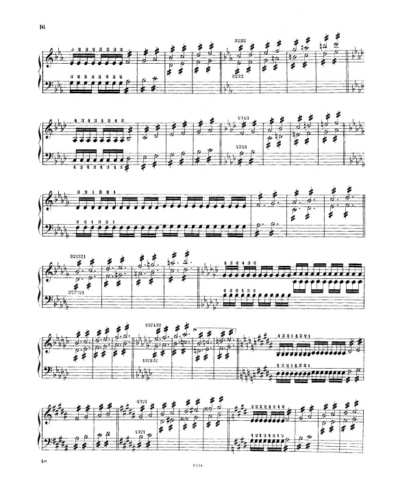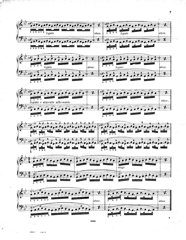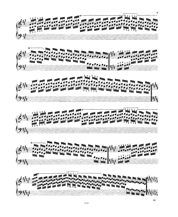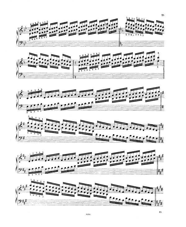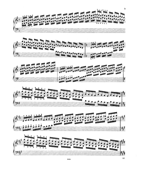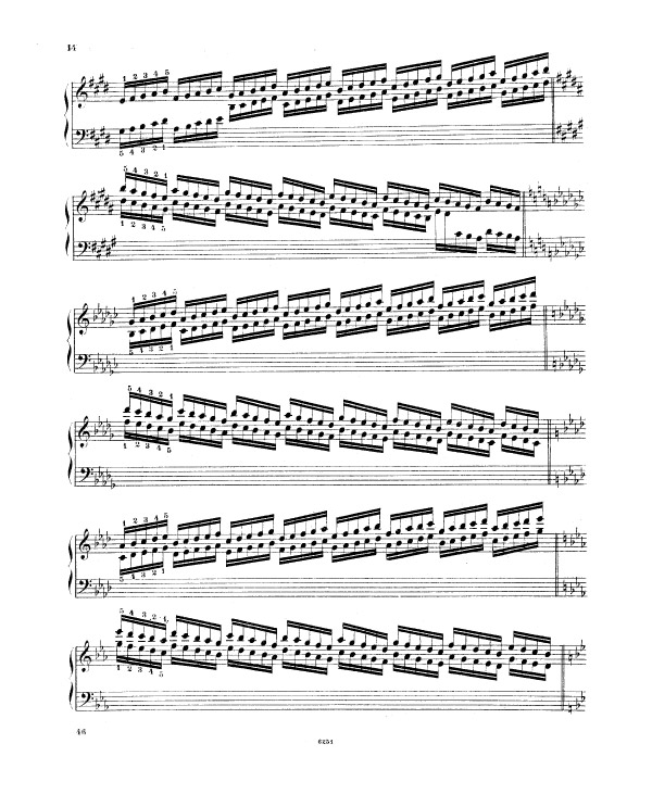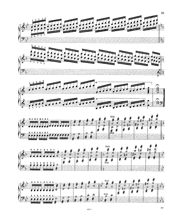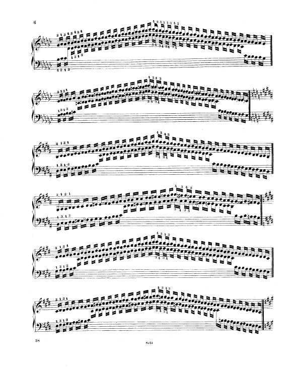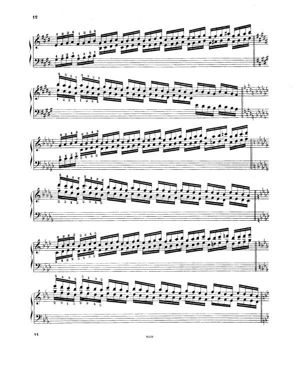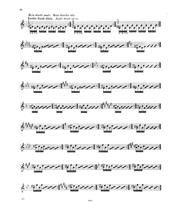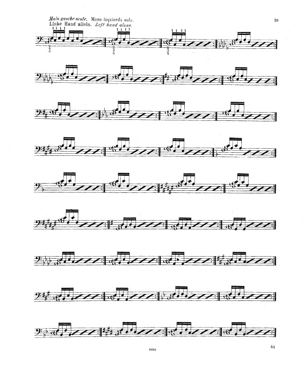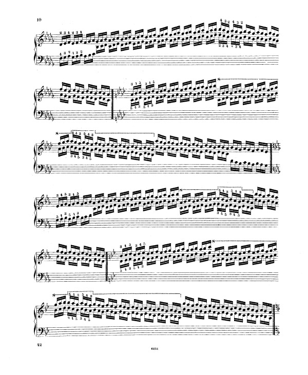 Liszt enchaine sur l’exercice 9 (notes répétées) et l’exercice 10 (passage de pouce), ce travail préalable sur le déplacement de la configuration de type cinq doigts, travaillée méthodiquement et progressivement (exercices 5 à 8). Tout ceci avant de rassembler les trois difficultés d’égalité des cinq doigts dans un contexte de déplacement (exercice 5 à 8), de transmission du mouvement 2-1 dans un contexte de notes répétées (exercice n° 9) et de déplacement latéral du pouce sous la main, passage de pouce, dans un contexte de notes tenues (exercice 10 et 11) sous la forme des traditionnelles et classiques gammes majeures dans tous les tons.