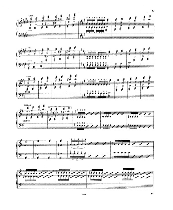 L’originalité de Liszt est ensuite de faire dériver le travail de l’écriture en accord (exercices 2 à 4) des exercices de cinq doigts destinés à faire travailler les doubles et les triples notes (exercice 1 mesures 319 à 453) puis les octaves, conçues comme extrémités de l’écriture en accords parfaits (1-2-3-5). Les exercices de doubles, triples notes et octaves reprennent le schéma rythmique et la progression de nuances des mesures 1 à 98 dont ils sont fondamentalement l’extension. En travaillant le mouvement de levier dans un contexte de doubles, triples notes et d’octaves associées à des notes tenues, Liszt montre bien que, pour lui, l’égalité de son et l’égalité entre les doigts sans oublier son corollaire qui est la capacité à faire ressortir à volonté dans un contexte polyphonique le ou les sons que l’on veut[23], s’obtiennent par une maîtrise parfaite du mouvement de levier. Par le moyen d’un exercice destiné à créer l’osmose la plus parfaite entre la main et le clavier, le corps et la machine, la main se machinise et le clavier s’organicise, le complexe corps-machine se trouvant alors en mesure de répondre subtilement aux sollicitations de l’esprit et de la pensée.