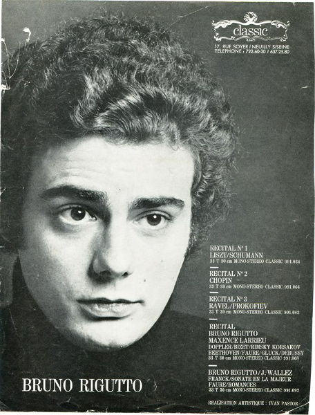 Bruno Rigutto: Hors de toute prévision. Il a fallu beaucoup de hasards, un concours de circonstances et d’événements inattendus pour que je m’assoie un jour devant un piano… Je ne suis pas issu d’une famille de musiciens. Mon père était un Italien du Nord (ma famille a ses racines en Frioul, en Vénétie) qui s’était réfugié en France parce qu’il avait refusé de saluer Mussolini. C’était un artisan, dans le sens ancien et toujours italien, d’ailleurs, d’artiste. Spécialiste de mosaïques, il s’était établi comme carreleur en banlieue parisienne. Ma mère travaillant aussi, j’ai été placé tout petit en nourrice, comme l’on fait dans ces cas-là, et notamment chez une dame de Maisons-Alfort. J’avais trois ans, elle était boulangère, elle avait un piano (je peux raconter cette histoire parce qu’on en connaît les détails avec précision), et c’est elle qui m’a appris les notes, après avoir réalisé que j’avais de l’oreille. En fait, elle devait même nous offrir son piano, parce qu’elle ne s’en servait plus. C’était une femme charmante qui a été très heureuse de m’aider. Au gré des horaires de mes parents, des possibilités des uns et des autres, j’ai fini par être gardé par toutes les dames ou presque du voisinage ! D’abord chez la femme du pharmacien, qui avait de meilleures notions musicales, puis chez telle autre, et puis chez une autre encore, mais chaque fois je pianotais sur les claviers qui se présentaient.